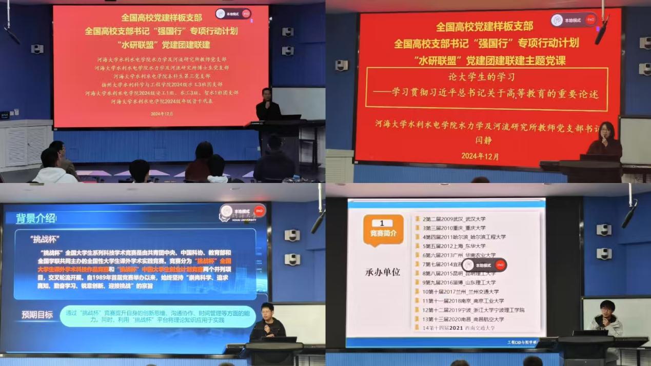 水力学及河流研究所教师党支部青年教师代表徐津、博士生党支部党员代表刘进,分别分享“挑战杯”全国大学生课外学术科技作品竞赛、“高教杯”全国大学生先进成图技术与产品信息建模创新大赛的参赛经验与指导体会,加强学生科创思维,提升创新能力。