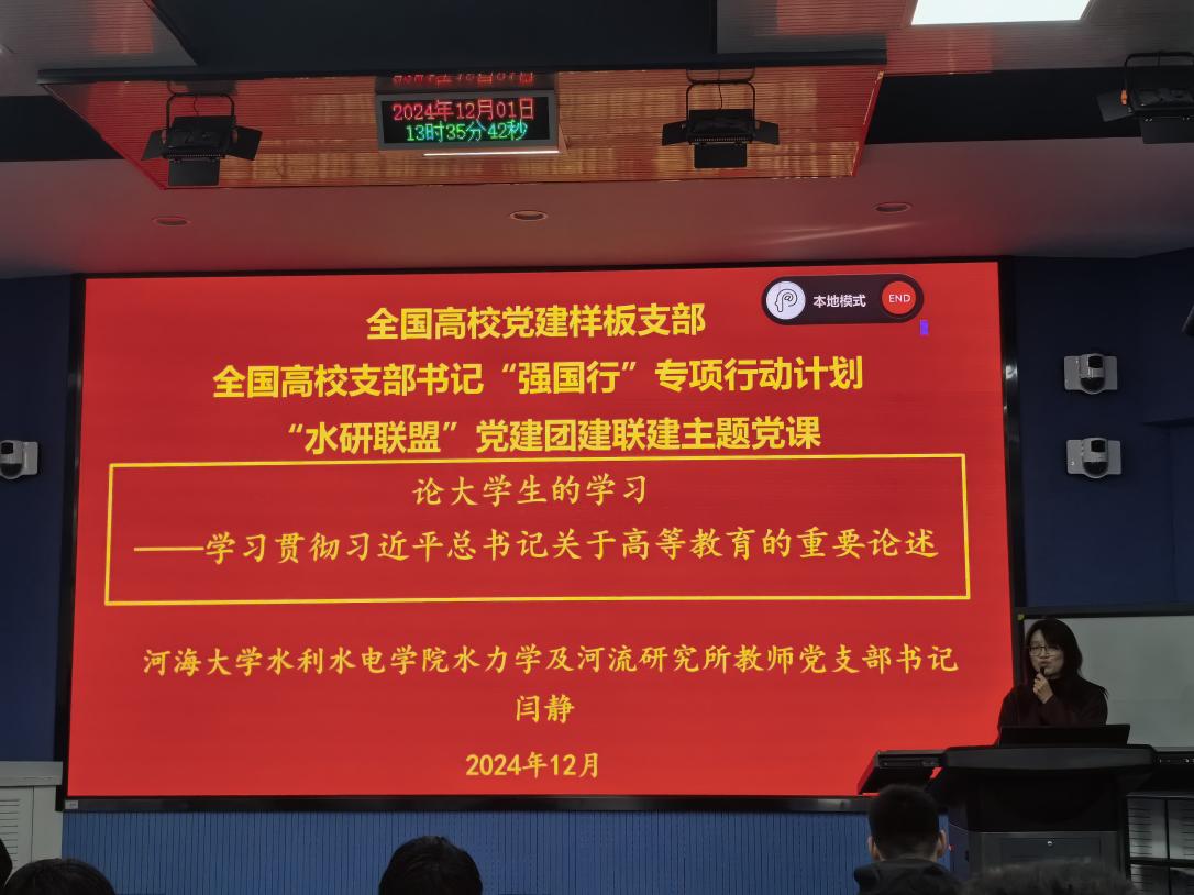 水力学及河流研究所副所长、教师党支部书记闫静为在场全体师生党员讲了一堂题为《论大学生的学习——学习贯彻习近平总书记关于高等教育的重要论述》的党课。从“我们为什么要学习、我们要学习什么、我们要怎么学习”三个方面展开,立足水利水电工程专业学习实际,引导新生同学们培养学习思维,明确前景目标,号召水利学子坚定不移听党话、跟党走,以及对学生立德成人的美好愿景。