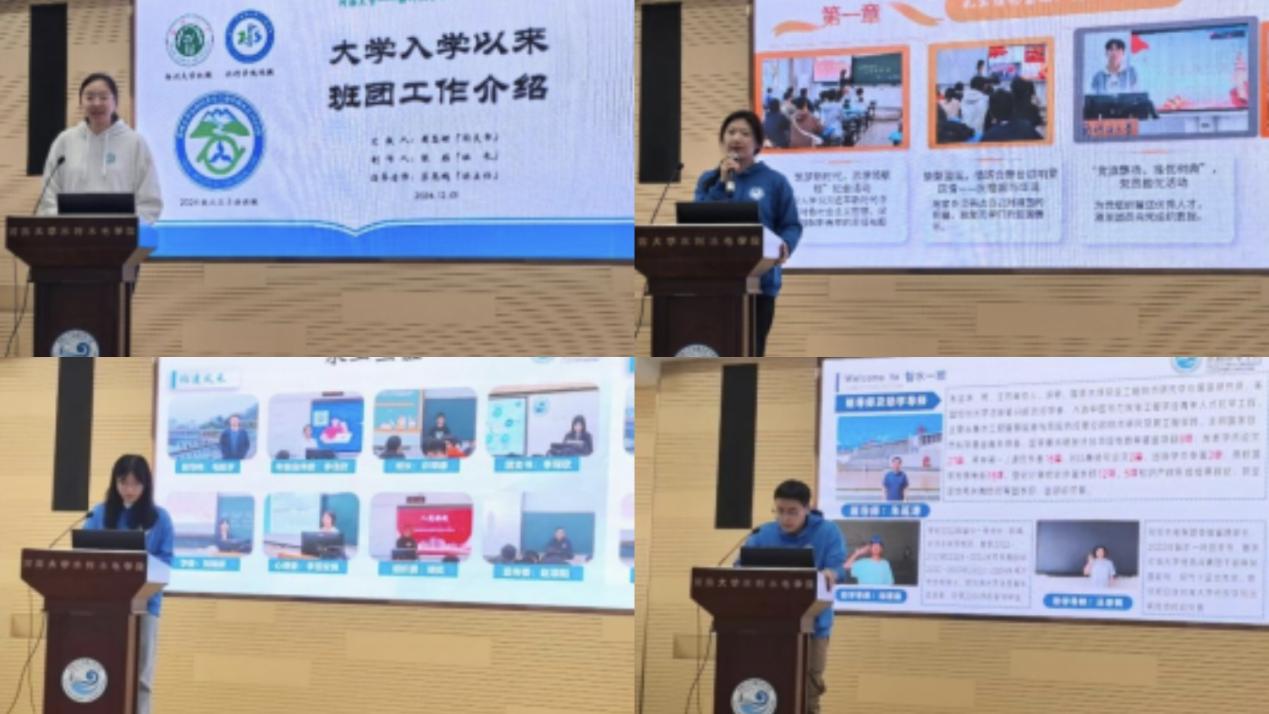 扬州大学水利科学与工程学院水工2403班、我院2024级水工三班、智水一班、安工一班依次上台汇报交流,从班团基本情况、思想政治建设、学风班风建设、寝室文明建设、班级文化建设、未来共建想法等6个方面展开,向大家详细介绍了班级和团支部在大学入学3个月以来开展的班团活动情况及取得的成效。双方同学发表共建感想,对汇报内容进行交流分享,指出对方班团活动中值得学习的地方,同时对未来双方可能的合作领域进行展望。双方学生开展“1+1结对”活动,互换写有祝福和期待的明信片,互赠校园文创纪念品,增进友谊。