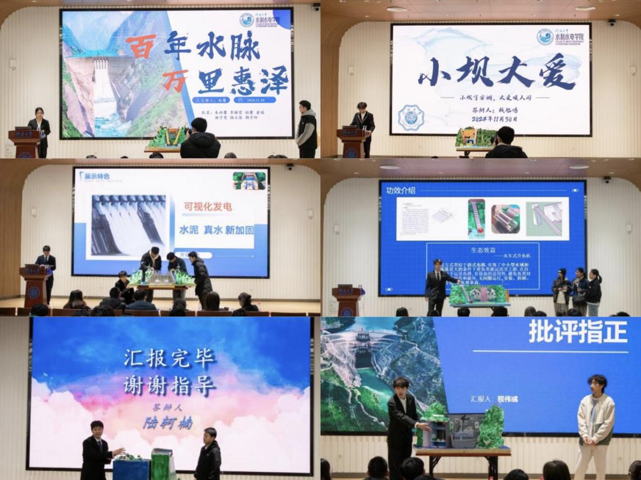 比赛现场,选手结合PPT、SU三维建模、动画演示、实物演示等形式,展示所做大坝模型,说明作品制作理念、创新亮点等基本信息。评委老师在充分了解各组坝型的特点后,感叹同学们的设计巧妙、想法独特,也从坝体结构、专业布置、创新设计等多方面提出宝贵意见和进一步改进的建议。