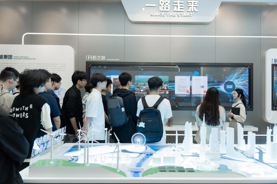 在专业讲解员的引导下,师生团队首先步入精心布置的展厅,为满足深度探究需求,展厅特别设置了智能化交互平台。通过触控操作,师生们既能调取重点项目的三维动画演示,又能查阅企业自主研发的核心技术专利。当指尖划过屏幕,一组组数据图表跃然眼前:从"华龙一号"核电机组的自主创新突破,到"人造太阳"ITER项目的国际合作典范,这些数字背后凝聚着华兴人突破"卡脖子"技术的智慧结晶。