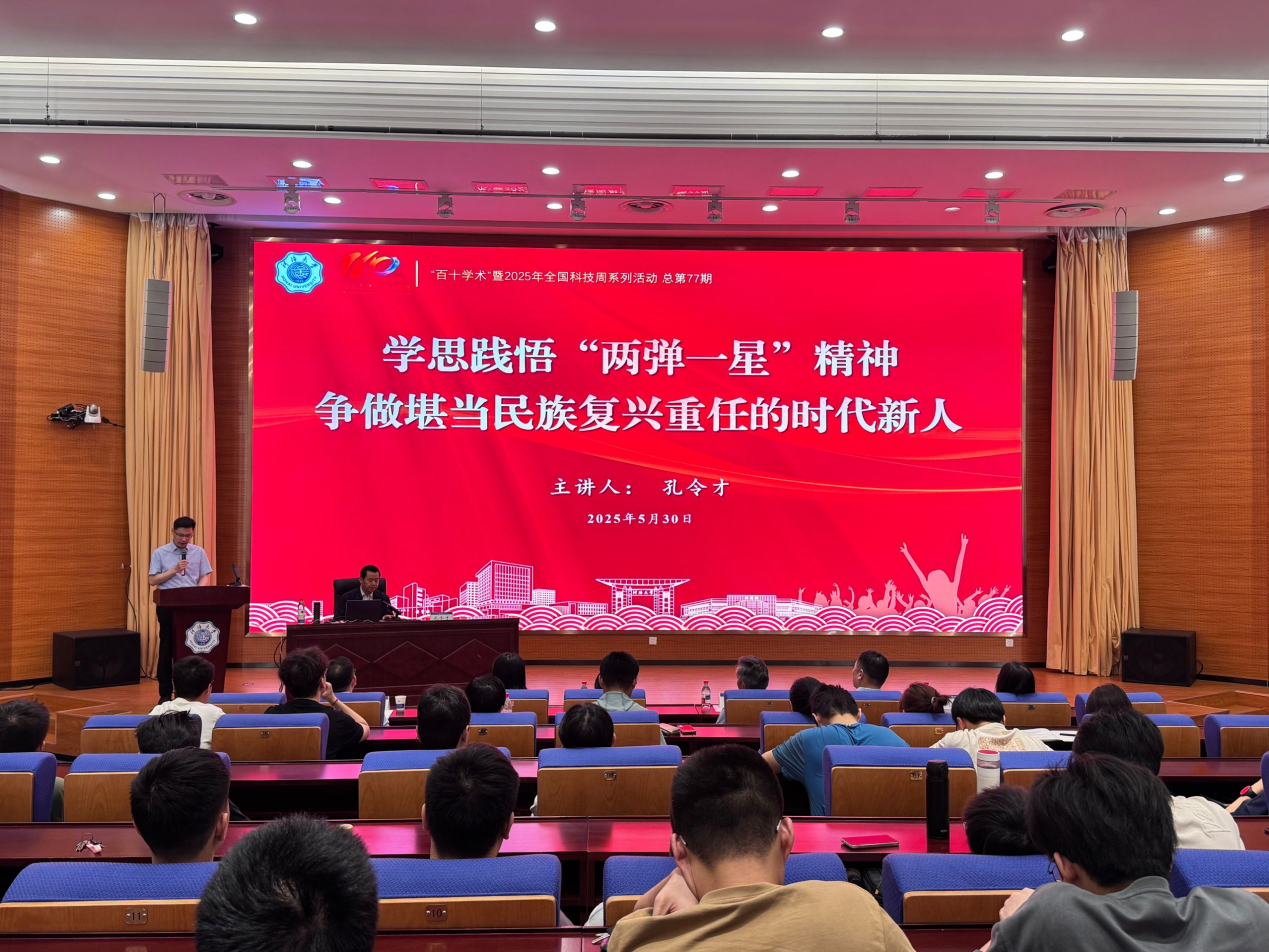 530日,我院举办“百十学术”校庆系列活动总第77期暨2025年全国科技周系列活动。马兰基地原政委、“两弹一星”历史研究会常务副理事长、全国高校“中国共产党人精神谱系”宣讲团成员、中国科学家精神宣讲团成员孔令才将军应邀担任主讲嘉宾,为我校师生作题为《学思践悟“两弹一星”精神,争做堪当民族复兴重任的时代新人》的专题报告,活动由开云电竞网副校长沈扬主持,学院院长王媛、副院长俞晓东、党委副书记戴媛媛、教师和学生代表共计150余人参加。