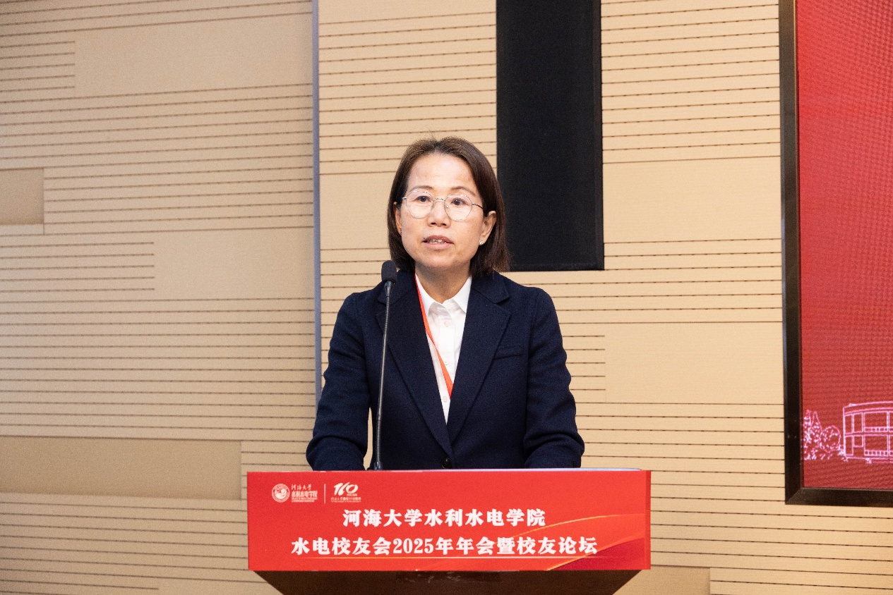 王媛院长首先代表学院向长期以来始终心系母校、支持学校学院建设与发展的各位校友致以最衷心的感谢和最崇高的敬意!她表示,学院始终以"治水兴邦"为己任,紧密围绕国家重大战略需求及世界科技发展前沿,制定学科发展的战略规划,在科技创新、人才培养、国际交流等领域取得了一定的成绩,以争创一流的毅力和意志,不断深化内涵式高质量发展。期盼校友们一是坚守初心,勇担使命,在水利事业发展中再立新功。二是常念母校,情系学院,在产学研合作中深化共赢。三是薪火相传,引领后学,为国家强国建设、民族复兴伟业贡献河海水电人的智慧和力量。