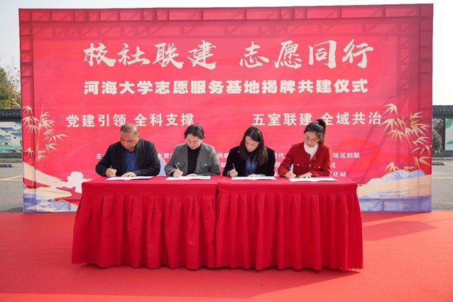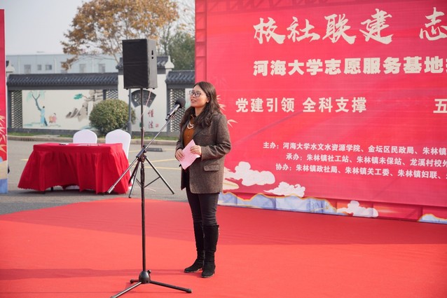 金坛区民政局副局长孙遐、朱林镇党委委员、政法委员张亮等对我院师生表示热烈欢迎。签约仪式开始前,学院党委副书记陈培玲介绍了学校及学院发展历史以及学院学生志愿服务活动开展情况,她表示,金坛自然风光优美,人文底蕴深厚。校社共建志愿服务基地能有效汇聚多样化的志愿组织力量,创新志愿服务理念,优化志愿服务体系,深化志愿服务育人成效,培养出有理想、敢担当、能吃苦、肯奋斗的新时代“水之子”。陈培玲书记对金坛区民政局、朱林镇政府、小红妈爱心社对活动的大力支持表示感谢。
