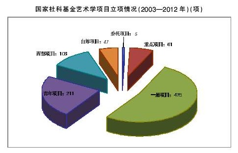在项目设置上,艺术学项目从名称到类别都日趋规范:从2005年起,设立艺术学西部项目;从2007年起,将原“全国艺术科学规划课题”统一更名为“国家社会科学基金艺术学项目”,并将评审立项周期由每两年一次改为一年一次,同时取消原自筹经费项目类别,分设委托项目、重点项目、一般项目、青年项目和西部项目五大类。从2011年起,开展了艺术学“后期资助项目”、“成果文库项目”、“学术期刊”的初评工作;2012年下半年尝试开展重大招标项目评审工作,开创了艺术学项目评审新局面。此外,已建成涵盖18个学科1400余名专家的数据库,为课题评审、成果鉴定、重大问题咨询等提供了有力保障。总之可以说,在国家社科基金的鼎力支持下,当代中国文化建设的“艺术之翼”正在悄然展开,期待着振翅欲飞。