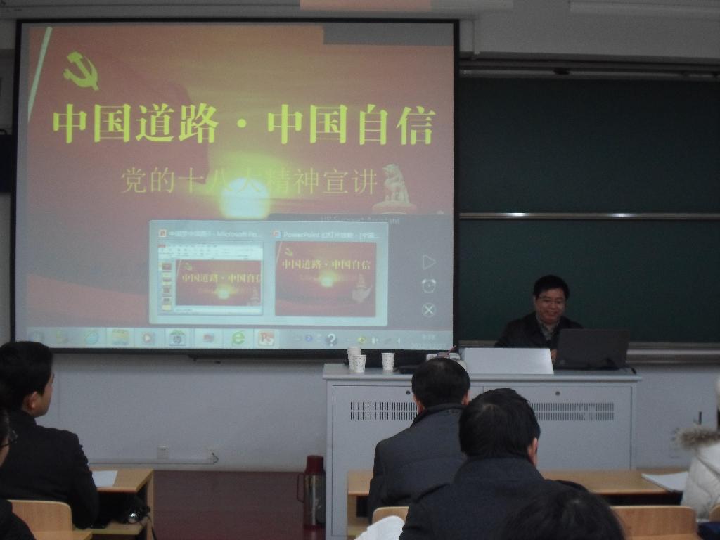 20121227日上午,受马克思主义学院邀请,党的十八大精神江苏省宣讲团成员、江苏省委宣传部干部管理处处长、开云电竞网兼职教授、博士生导师双传学在开云电竞网江宁校区博学楼B203会议室做了一场题为“中国道路 中国自信——党的十八大精神”的报告。报告会由思想政治教育研究所所长孙其昂教授主持,政治教育系副主任郑黎明副教授、李宁副教授等老师和思想政治教育专业本科生、研究生以及其他专业研究生参加、聆听了此场报告。