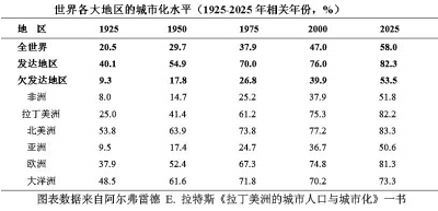 拉美城市化起步于20世纪40年代,是由肇始于30年代的进口替代工业化进程所推动的,比西方发达国家要晚得多。到2000年,拉美城市化率达到75.3%,仅低于北美洲而略高于欧洲和大洋洲。短短60年内,拉美的城市化水平就赶上甚至超过了发达地区,是全球六大地区中城市化速度最快的,因此,被公认为“过度城市化”。