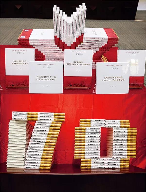 中国社会科学院组织专家学者编写了《习近平新时代中国特色社会主义思想学习丛书》、《庆祝中华人民共和国成立70周年书系》。上图为《习近平新时代中国特色社会主义思想学习丛书》,分12个专题阐释习近平新时代中国特色社会主义思想的重大意义、主要观点、精神实质,阐明这一思想为发展马克思主义作出了中国的原创性贡献。下图为《庆祝中华人民共和国成立70周年书系》,分为国家发展建设史和哲学社会科学学术研究史两个序列,回顾总结了中国社会主义建设取得的巨大成就和中国特色哲学社会科学发展壮大的历史进程,共30册,首批出版13册。