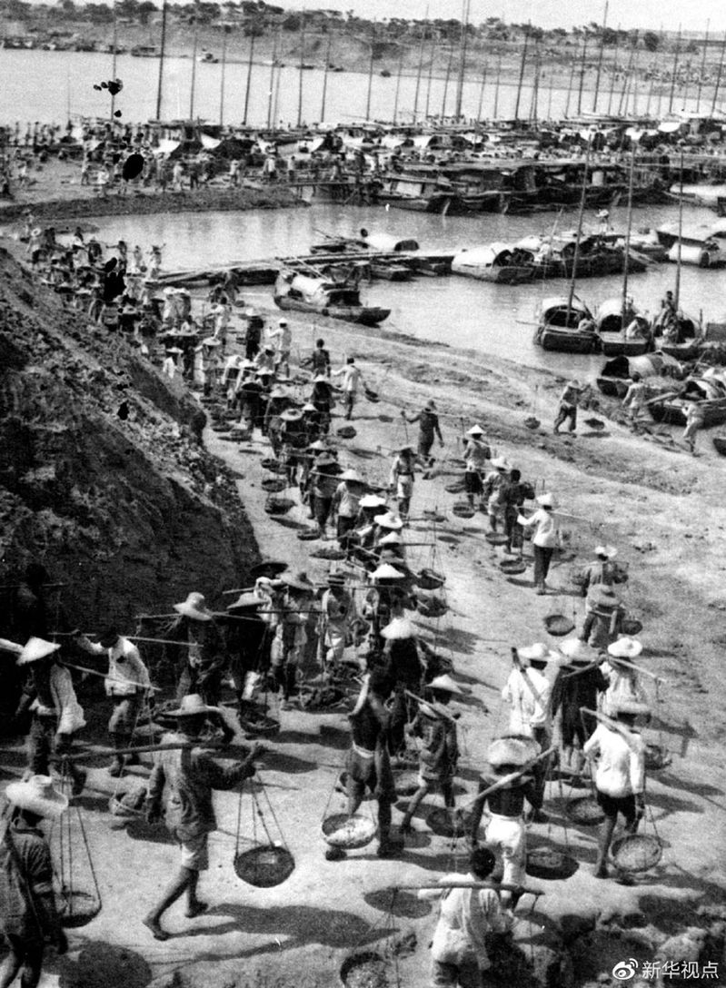 民工在安徽润河集蓄洪分水闸工地施工(1951年摄,资料照片)。