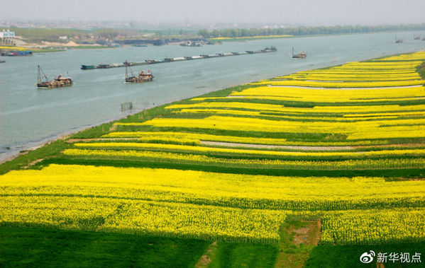 2008年3月27日,一支运煤船队通过岸边开满油菜花的淮河淮南段。金黄色的油菜花和绿油油的麦苗使得淮河岸边美景如画。新华社发(陈彬摄)