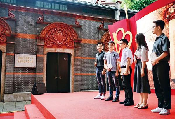 2020年6月29日,“新时代答卷人——上海市教育系统庆祝中国共产党成立99周年暨学生爱国主义教育主题活动”在中共一大会址前举行。来自复旦大学、同济大学、上海建桥学院、上海市曹杨第二中学等8所学校的200余名师生代表参加活动,通过情景讲述、现场教学、集体朗诵等形式,庆祝中国共产党成立99周年,展现广大上海学子的爱国情、强国志。图为复旦大学师生代表在一大会址前展示情景教学。 新华社记者 刘颖/摄