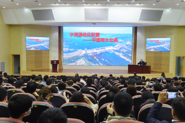 仪式结束后,刘春生为教师和学生们做了题为《水资源优化配置-中国南水北调》的学术报告。他在水利工程特别是调水工程领域积累了丰富的实践经验,为我国重大水利水电工程建设、南水北调实施、流域综合治理、区域水安全保障做出过突出贡献。他从中国水资源分布、中国年降水量分布、黄淮海流域水资源自然特征等角度切入,详细介绍了南水北调工程总体规划、工程建设、感想体会、战略机遇等方面的情况,整体报告数据详实,图文并茂,风趣幽默,深入浅出。与会师生们认真聆听了报告,并在会后就南水北调相关问题进行了深入交流与讨论。