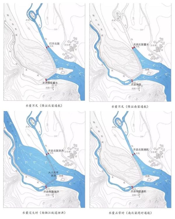 为了将湘江水导入灵渠,需建一道“前锐后钝”的分水堤。因其形似犁铧,故名“铧嘴”。“铧嘴”后接两条长堤:北堤稍长,称“大天平”;南堤稍短,称“小天平”。三者组建成人字形分水堤。“铧嘴”前端直指湘江上游,将水流一劈为二。三分南流,被“小天平”导入南渠;七分北流,被“大天平”导入北渠。南渠向西延伸汇入漓江,北渠向北延伸重回湘江。因此,灵渠包括南北两条水渠,各有分工,相辅相成。