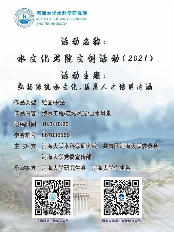水是与人类生存发展息息相关的自然资源,人类与水的关系是一种独特的文化现象,以水为载体的人类实践活动产生了具有特定内涵的水文化。为弘扬传统水文化,拓展人才培养内容,发挥学生特长,激发从业兴趣和热情,特此举办“水文化书院文创活动”。