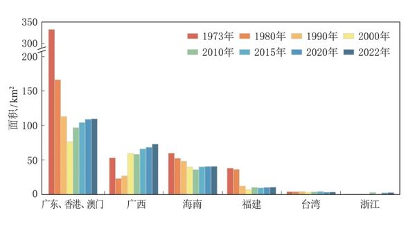 中国红树林面积总体呈先减少后增加趋势。1973~2000年,中国红树林面积减小,其中广东、香港和澳门红树林面积减少最为明显;2000~2022年,中国红树林总面积稳步增加,至2022年已达到240平方公里,基本恢复至1980年水平,其中广东、香港和澳门红树林总面积基本恢复至1990年水平。