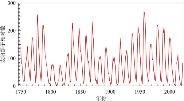 1750~2022年太阳黑子相对数年平均值变化