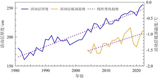 青藏公路沿线多年冻土退化趋势明显。1981~2022年,青藏公路沿线多年冻土区活动层厚度呈显著增加趋势,平均每10年增厚19.9厘米;2022年多年冻土区平均活动层厚度为256厘米,是有连续观测记录以来的最高值。2004~2022年,活动层底部(多年冻土上限)温度呈显著的上升趋势,综合分析表明青藏公路沿线多年冻土呈现明显的退化趋势。
