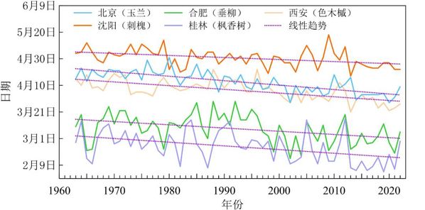 中国代表性植物春季物候期呈提前趋势。1963~2022年,北京站玉兰、沈阳站刺槐、合肥站垂柳、桂林站枫香树和西安站色木槭展叶期始期均呈提前趋势,平均每10年分别提前3.3天、1.5天、2.4天、2.8天和2.8天。各站代表性植物落叶期始期变化年际波动较大,2022年,沈阳站刺槐落叶期始期较常年值偏晚20天,为1963年以来第二晚。