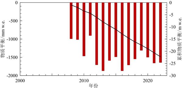 和累积物质平衡(曲线,相对于2008年)变化