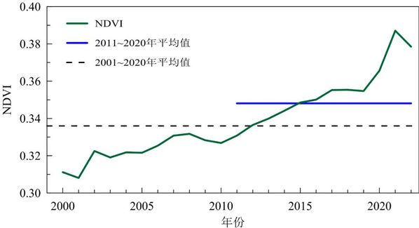 中国植被覆盖整体稳定增加,呈现持续变绿趋势。2000~2022年,中国年平均归一化植被指数(NDVI)呈显著的上升趋势,2022年中国平均NDVI为0.379,较2011~2020年平均值上升8.7%,是2000年以来的第二高值。