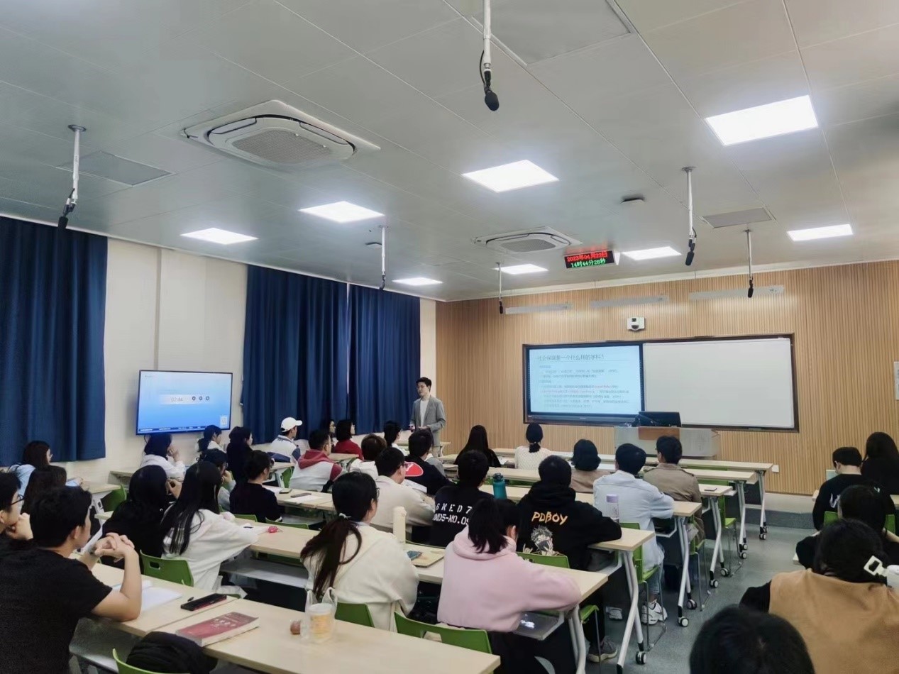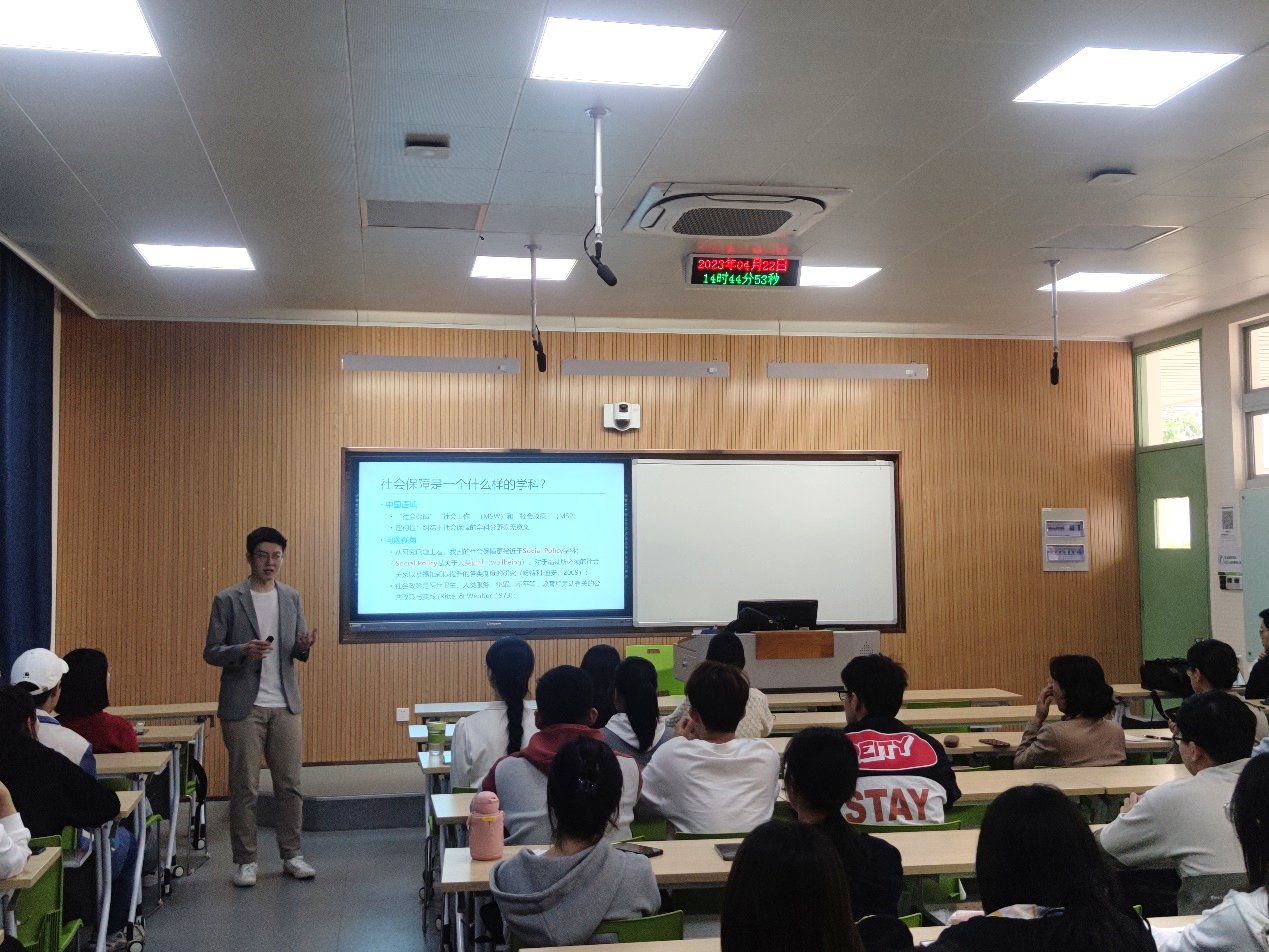 接着王中汉围绕社会保障学科问题导向性、实践性、跨学科性三重特性进行了详细阐释。问题导向性是回应社会问题的专业使命,对社会现实和变迁趋势敏锐度的表现;实践性是政策何处去,政策企业家理论知识转化生产的要求;跨学科性是对交叉研究,博而不专认知误区及选择权的回应。王中汉结合管理学和社会学理论,对英国全民医疗、法国延迟退休、ChatGPT、星舰计划等国际实事以及自身在河海、人大、浙大的学习实践,提出同学们当下主要任务是认清训练智识和积累知识的学习终极价值以及掌握理论基础和方法能力。