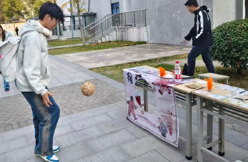 作为传承了千余年的中式“足球”,蹴鞠不仅在传统文化中享有特殊地位,而且对青年学子也有很强的吸引力,活动现场吸引了大量同学一试身手。根据设定,每名活动参与者有五次机会在指定线外将球踢入“风流眼”,命中三次即为成功。从瞄准到起脚,大家全神贯注,每当蹴鞠精准入门,便会引来一片由衷的赞叹与鼓励的掌声。