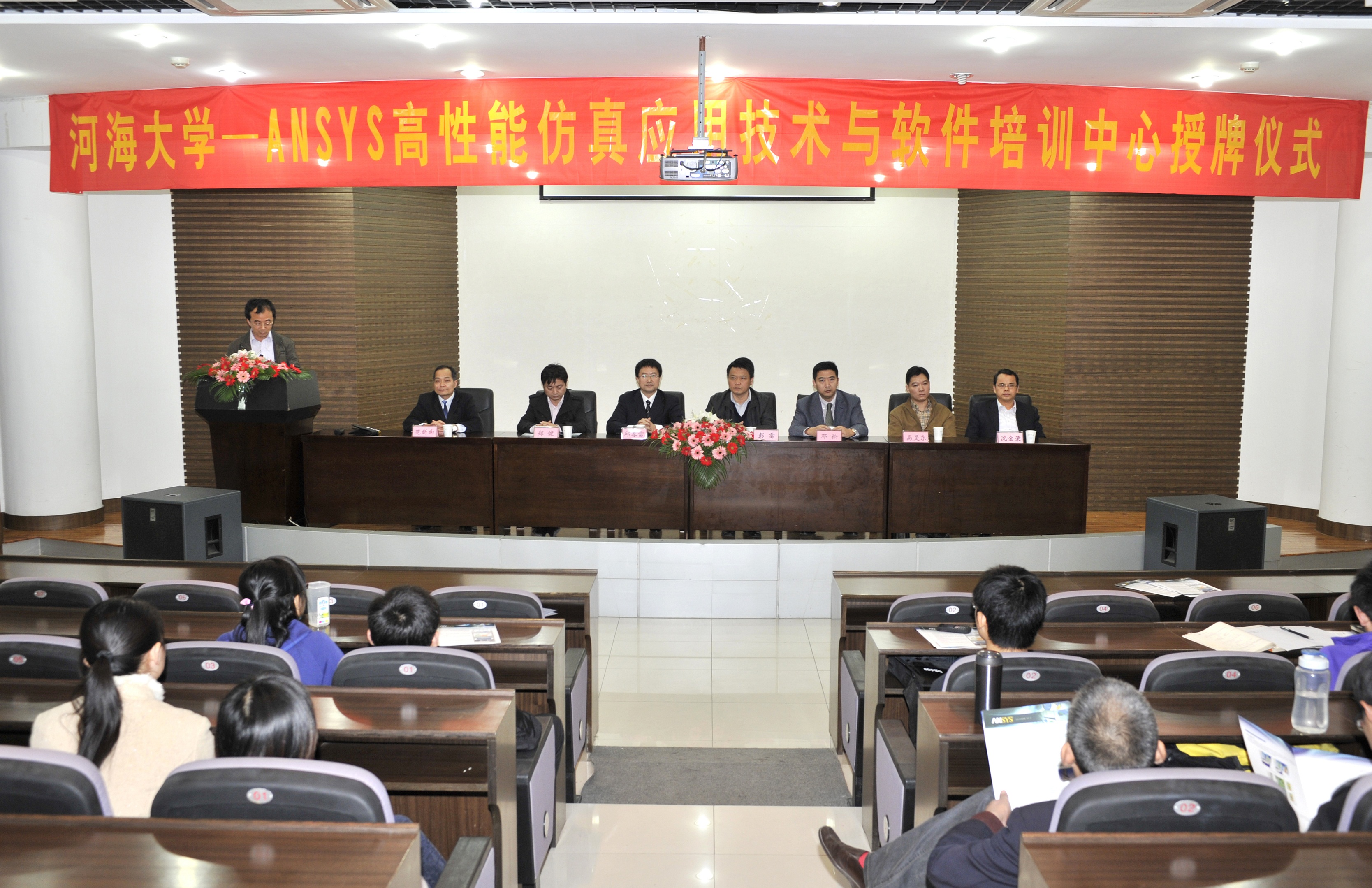 校区管委会副主任彭雷参加授牌仪式并讲话。江苏省输变电装备产业技术创新战略联盟秘书长郑健,省输配电重点实验室主任、计算机与信息学院(常州)院长范新南,校区科技部副部长沈金荣,ANSYS中国销售总监邱春雷,常州太平洋电力设备(集团)有限公司总经理、重点实验室产业教授高旻东以及省重点实验室部分教师参加了中心成立暨授牌仪式。