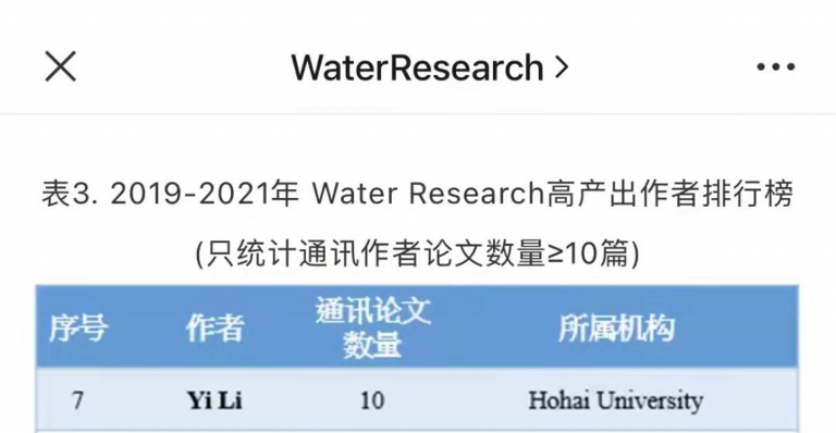 李轶教授入选2019-2021年《Water Research》高产出作者排行榜