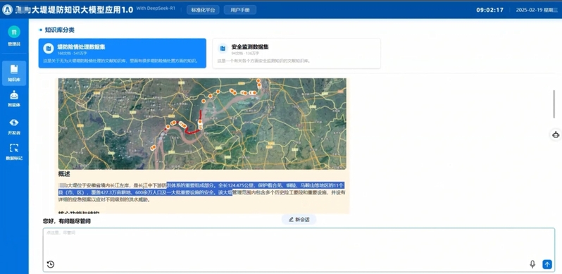 通过深度集成堤防知识库,平台提供了交互式问答功能。管理人员可以快速查询堤防设施的维护记录(如护坡、排水系统等)、历史加固情况等信息,能够根据知识库中的数据迅速给出准确答复,极大提高了工作效率和决策质量。