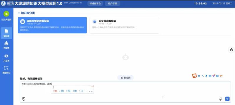 针对传统堤防管理依赖人工巡检与经验判断,面临数据分散、响应滞后、风险预判不足等难题,河海科技公司依托长期积累的堤防管理、防汛应急、工程建设等相关资料,融合客户方的工程档案、水文气象、历史险情记录等多维度数据,基于DeepSeek 建立了客户方需求的本地化大模型,建立了专属堤防数据库,并推出垂直领域智能助手“堤小智”,为堤防监测、应急响应与决策管理提供全程智慧化支持。