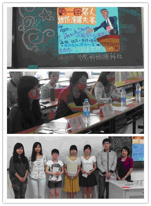 2013年5月22日下午16时,外国语学院I have a dream英语名人演讲模仿大赛在博B202准时举行。此次活动由外国语学院学生科协主办,由外国语学院尚思演辩社承办。应邀出席此次活动的评委有外国语学院12级班导师沈琦副教授,外国语学院研究生科协主席李莹同学和优秀学生代表陈雨诗同学。此外,外国语学院的部分同学也到场观看了此次大赛。