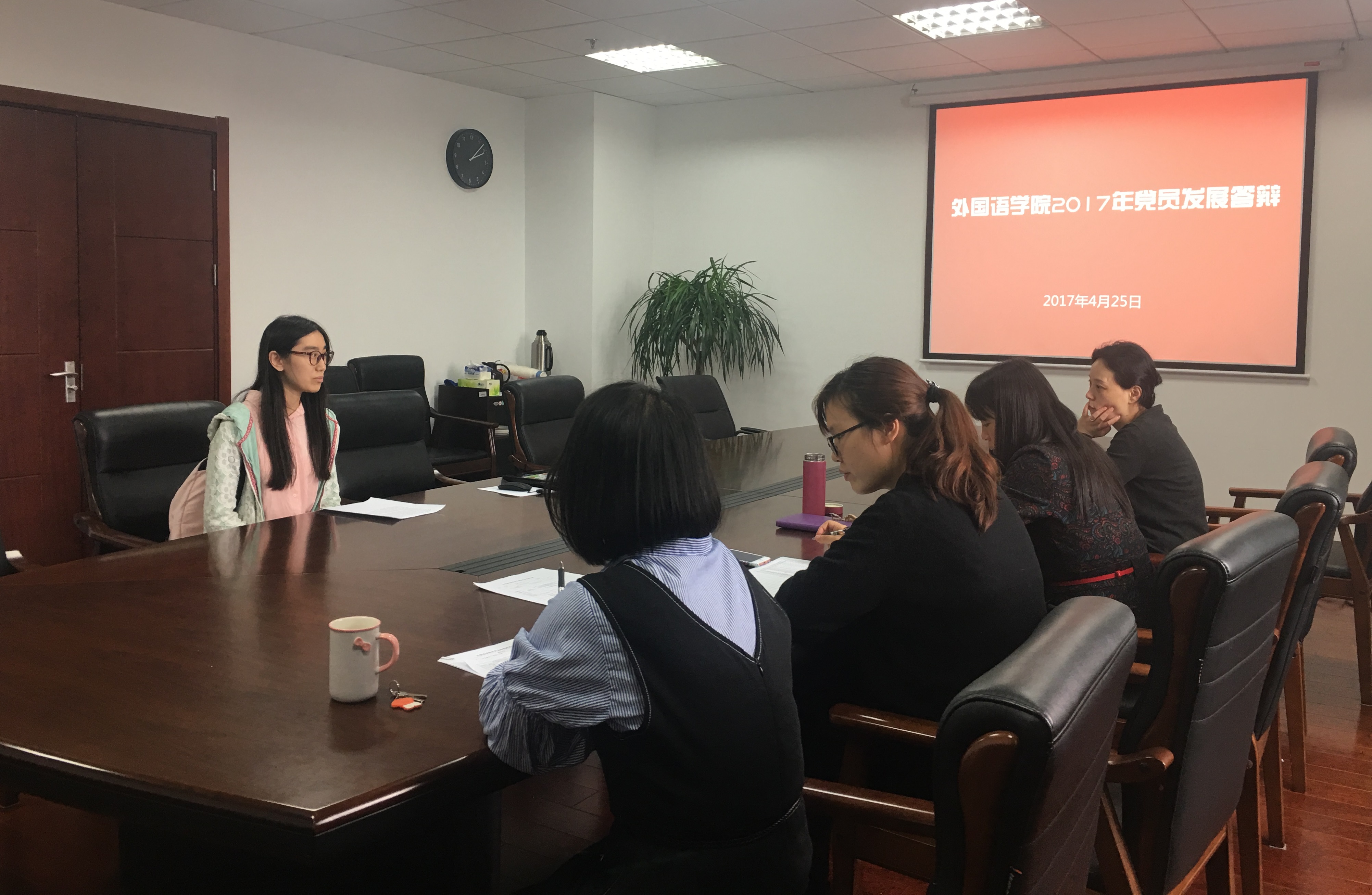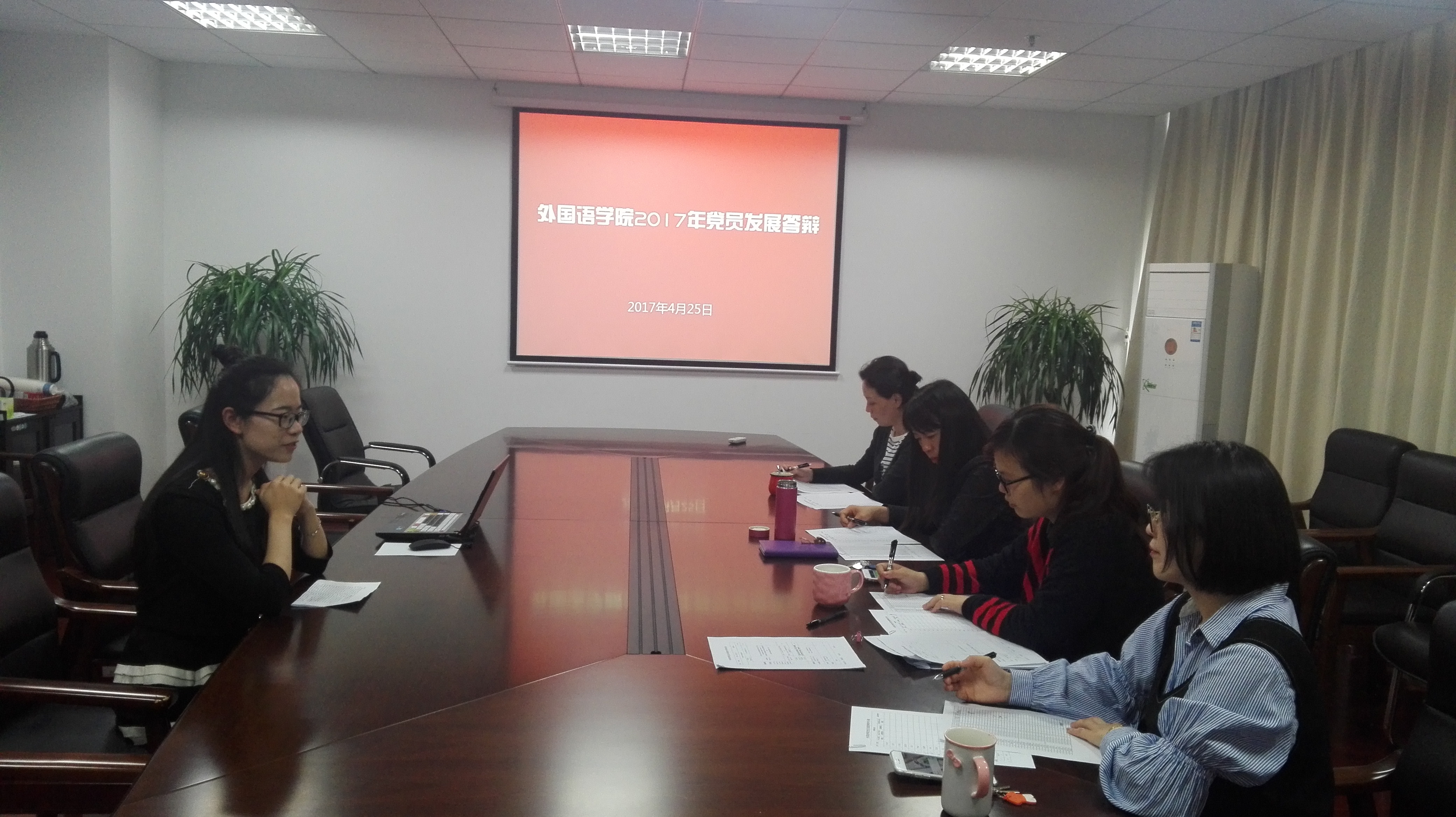 为了进一步了解入党申请人的基本情况,深化“两学一做”学习教育成效,根据《中国共产党章程》和《中国共产党发展党员工作细则》的相关要求,我院于4月25日下午,在行政楼611召开了2017年上半年党员发展答辩会,院党委副书记朱志梅、办公室主任兼两办支部书记吴桦、本科生辅导员王璐、组织员赵青青出席本次答辩会。