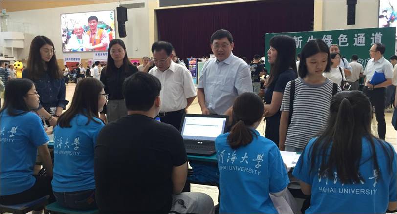 校党委书记唐洪武、校长徐辉、校党委副书记郭继超、学生处长吴红、副处长汤鸣鸿在学院党委副书记朱志梅的陪同下视察我院新生报到点
