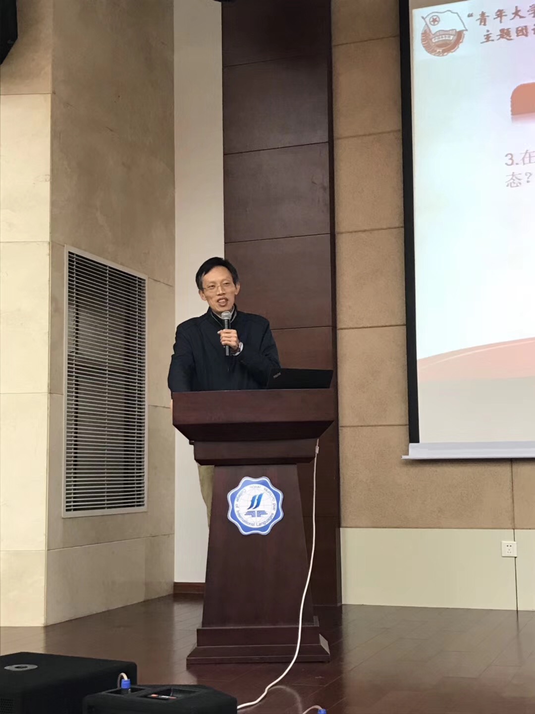 2018年11月5日,外语院新思想公开课在江宁校区行政楼报告厅开讲啦。此次活动由外语院团委组织,邀请高年级优秀团员、大学生骨干为主讲人,与2018级本科生全体团员青年面对面交流。学院党委雷贵荣书记,团委书记王璐老师、辅导员蒋艺晴老师和尚聪老师作为嘉宾全程参与活动。