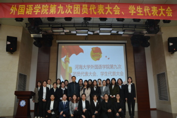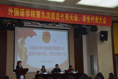 2018年11月29日晚,外国语学院第九次团员代表大会、学生代表大会在江宁校区召开。外国语学院党委雷贵荣书记、校团委戴媛媛副书记、外国语学院党委朱志梅副书记、院团委书记王璐老师、大学外语教学部周家宸老师、辅导员赵青青老师、蒋艺晴老师、尚聪老师,以及外国语学院研究生、本科生共计220名代表参会。