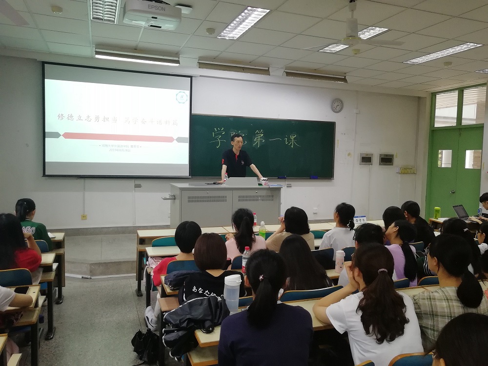 8月28日下午,院党委雷贵荣书记以《修德励志勇担当 笃学奋斗谱新篇》为题,为2019级本科新生讲授了学院第一课。雷书记从学院概况、习近平总书记说、社会需求、外院内涵等方面进行阐述,帮助同学们以正确的心态认识大学,希望同学们能够在宁静中坚守初心,珍惜韶华,永不懈怠,奋力拼搏。随后,张海榕副院长为大家讲授了学涯公开课,从专业认知、课程设置、职业生涯规划、就业前景等方面做了详细介绍,并以学院优秀学长学姐为例,鼓励大家积极进取,不负大学时光。