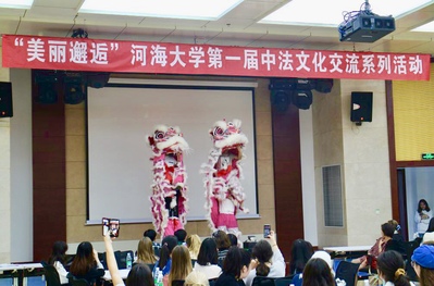 在文化交流联谊会上,我院法语系教师吴博和法方教师代表Viviane le Maire分别致辞,学生代表黄诗洁做了发言。联谊以“舞狮”开场,矫健的身姿与灵动的步伐在舞狮行头下相得益彰,赢得了法方师生的阵阵掌声;古筝与竹笛合奏,一曲《春华秋实》展现了华夏韵律之美;随着编钟乐起,中华“书法”吸引了众多学生的目光,展现中国工匠精神的“剪纸”表演更是让法方代表团眼前一亮。跨越千年的中华服饰秀完美凝练了东方美学的极致典雅;形式多样的歌曲串烧将活动氛围推向高潮。法方学生代表也为大家带来了两首中文歌曲《朋友》、《茉莉花》,展现了优秀的中文水平。在主题讨论环节,中法学生围绕传统文化的传承与创新展开讨论,学生们踊跃发言,各抒己见,充分表达了自己的观点和思想。