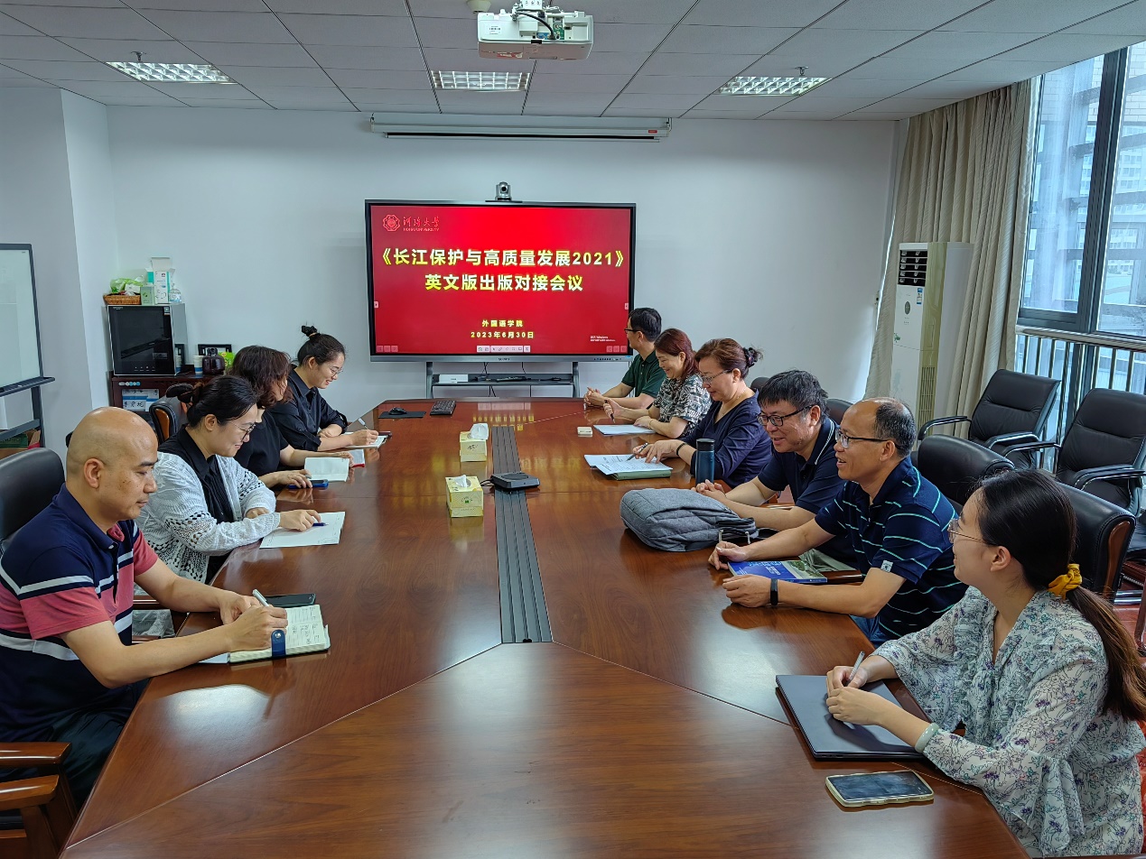 张海榕院长首先介绍了英文版翻译总体情况,并与出版社的老师初步确认了英文版的出版日期。出版社的老师询问了翻译过程中的具体问题和困难,并给出了解决方案,同时就后续排版中的问题等跟翻译团队老师做了交流和沟通。双方一致表示要把该书的翻译出版工作做好,用英语“讲好长江文化故事”,为落实“长江大保护”国家战略提供外语智慧。(恽如强)