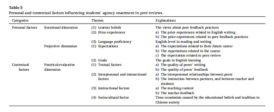 该研究揭示了学生在二语写作的同伴反馈中,受到来自多项个人因素和情境因素的交互影响,其中课程主讲教师的课堂教学是最为显著的正向影响因素。研究还揭示了学生反馈能动性在能动性生态框架迭代实践-评估目标维度中的独特表现,为构筑提升学生能动性的二语写作课堂提供了教学启示。