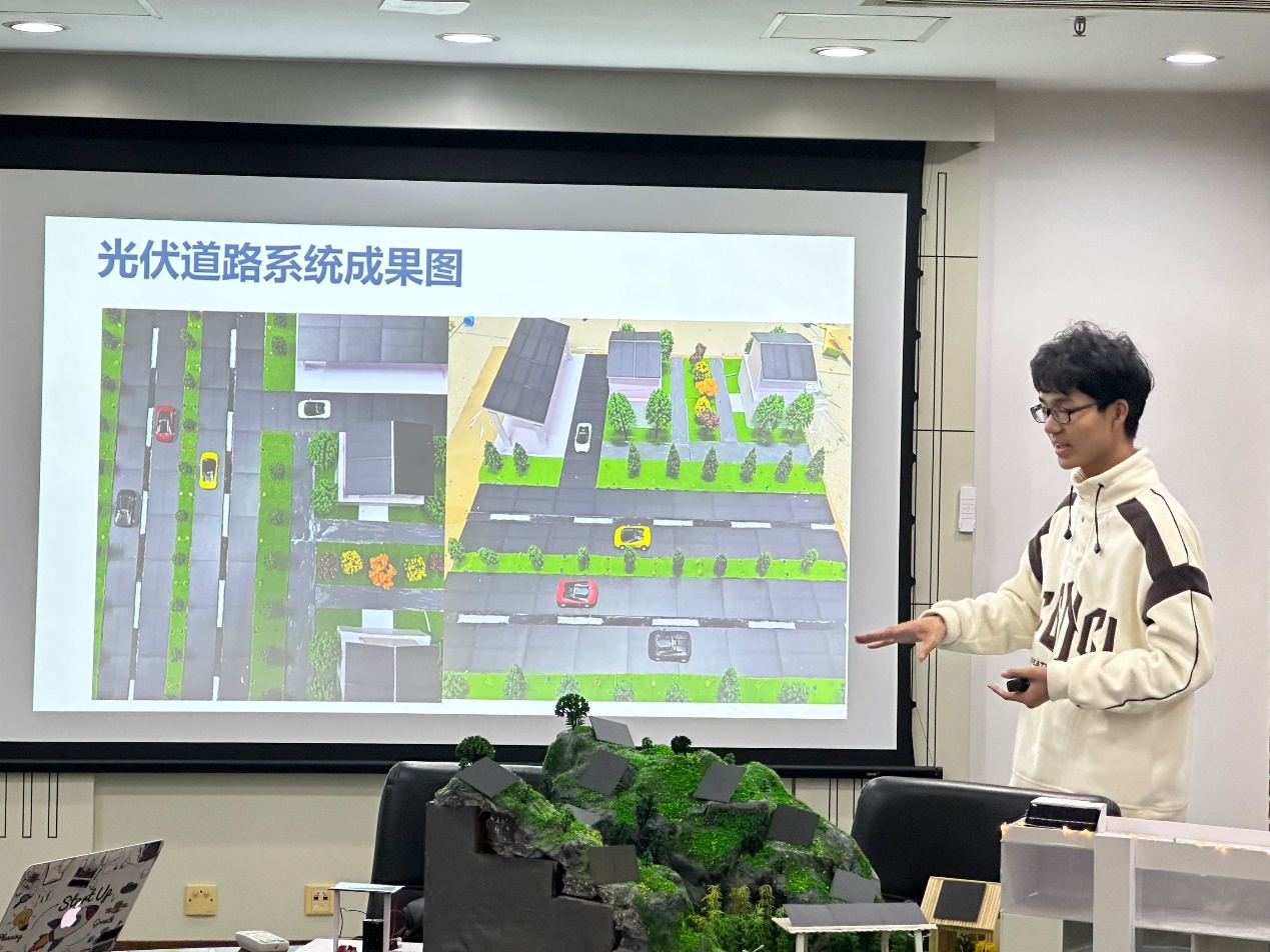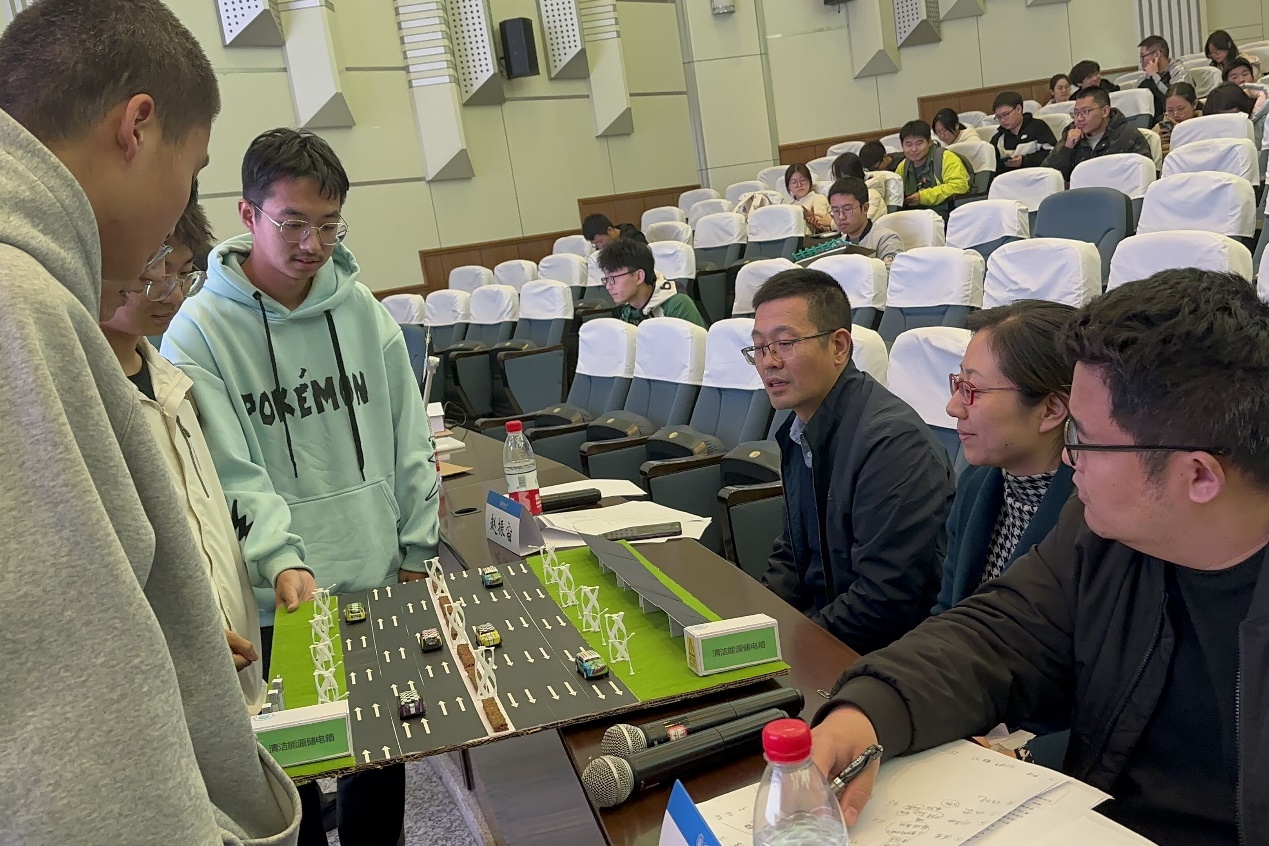 本次比赛共设置风力和光伏两条专业赛道,每条赛道设置模型搭建和应用场景创新两个方向,整个比赛分为两个阶段,第一阶段同学们自行组队报名,选定赛道方向后进行模型制作和场景模拟。第二阶段进行终审答辩,分为PPT演示讲解和实物展示两个环节。各组参赛同学将前期制作好的模型进行设计理念和创新性讲解,并配以模型的现场操作展示,评委老师从模型的美观性、创新性和可行性三个角度对作品进行评审赋分。