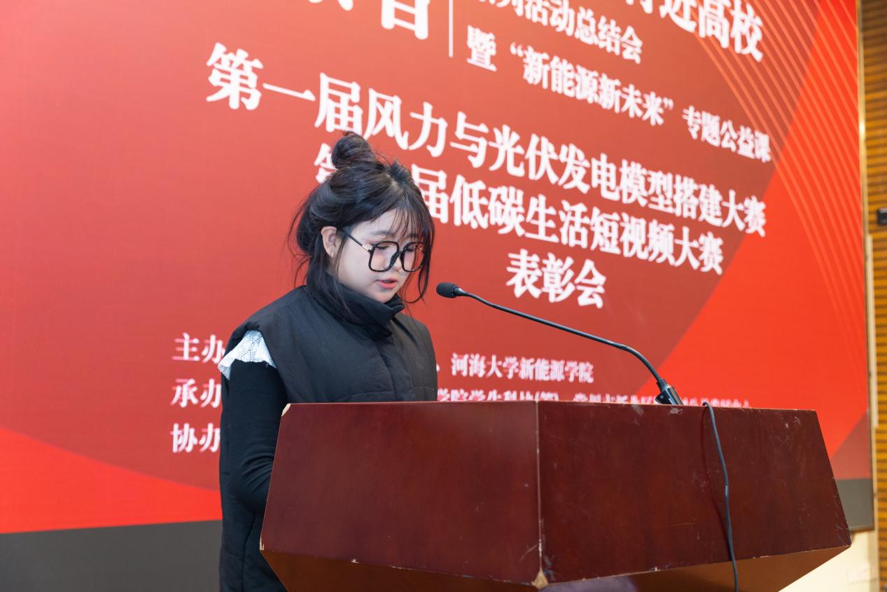 获一等奖团队代表陆雯发表获奖感言,简要介绍自己作品的内容和传达的信息,并表示:“作为一名河海广电人,我将继续用镜头记录生活,用影像传递环保理念。我知道一个人的力量小,但大家一起做,力量就大了。我也希望我们都能行动起来,一起保护低碳生活。”