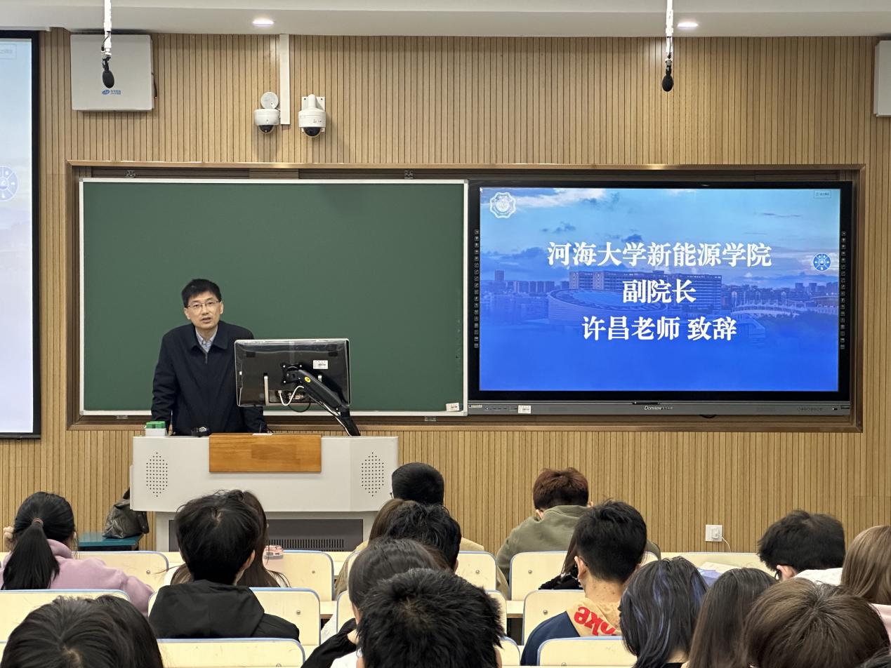学院副院长许昌致辞。许院长向同学们详细介绍了专业前景和近期的学科工作。首先,新能源学科与双碳政策联系最紧密。其次,目前新能源专业就业情况明朗,多家优质企业与河海新能源都有合作。最后,许院长提及了学院学科规划,预计拓展太阳能方向、储能方向学科。最后,许院长对大一同学们表达了真诚的期望与祝愿,表示希望新能源学院学生都能拥有光明的未来。