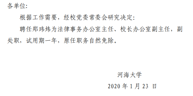 关于郑玮炜职务任免的通知