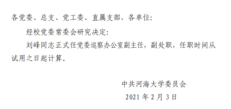 关于刘峰同志试用期满正式任职的通知
