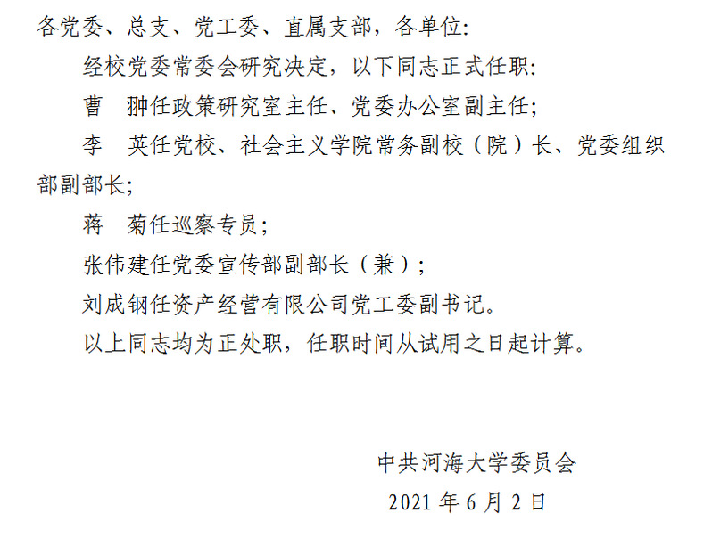 关于曹翀等同志试用期满正式任职的通知