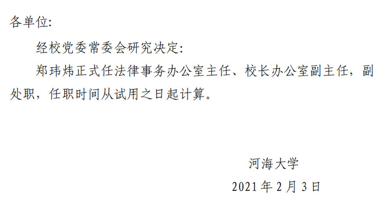 关于郑玮炜同志试用期满正式任职的通知