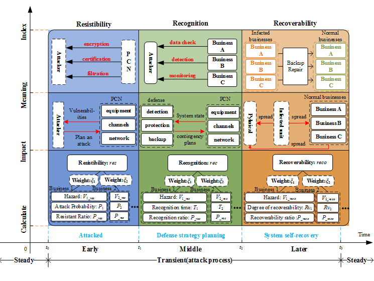 该文系统全面的分析了电力通信网络中潜在攻击的入侵路径、入侵机制和可能产生的后果;同时提出了一种考虑安全指标的防御措施的分类和评估方法,对现有网络攻击防御措施进行分类以及评估。首先,该文系统梳理了电力通信网络的典型结构,总结了电力通信网络中可能发生的网络攻击,并根据当前的学术研究和历史网络攻击的统计分析,将其分为热点攻击和非热点攻击。其次,针对不同的网络攻击,该文结合电力系统的实际业务以及通讯设备,详细分析了潜在的目标设备、传播路径以及对电力通信网络可能造成的后果。接着,基于电力系统在抵御不同阶段网络入侵的防御能力要求,该文提出了一个包含可抵抗性、可辨识性、可恢复性的安全指标体系,以评估不同防御措施的在攻击入侵前的抵抗能力、攻击入侵时的识别能力以及攻击造成破坏后的恢复能力。最后,根据不同措施对各个阶段网络攻击的防御能力,将防御措施分为抵抗性增强措施、识别性增强措施和恢复性增强措施。相应地,对不同防御措施的机制进行了安全性分析,根据防御措施和安全指数之间的相关程度来评估每个防御措施的有效性。同时,也为电力信息物理系统有针对性开展网络攻击防御提供了重要的参考价值。