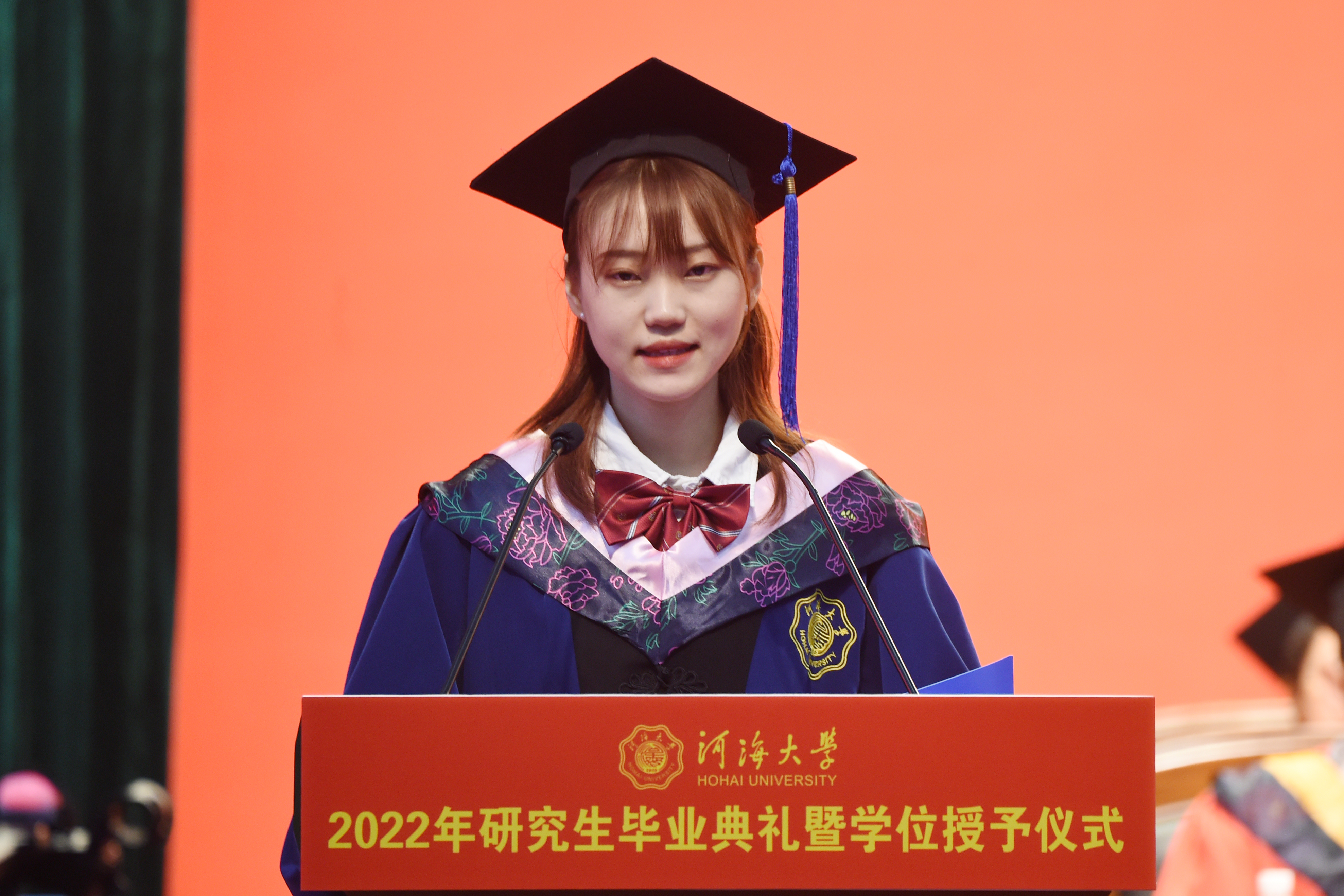 毕业生代表、国际贸易学专业硕士张艳丽代表全体毕业研究生表达了对母校、老师深深感激之情,表示将时刻践行校训,把青春之小我融入社会之大我,在实现中华民族伟大复兴中国梦的新征程上奋勇前行。