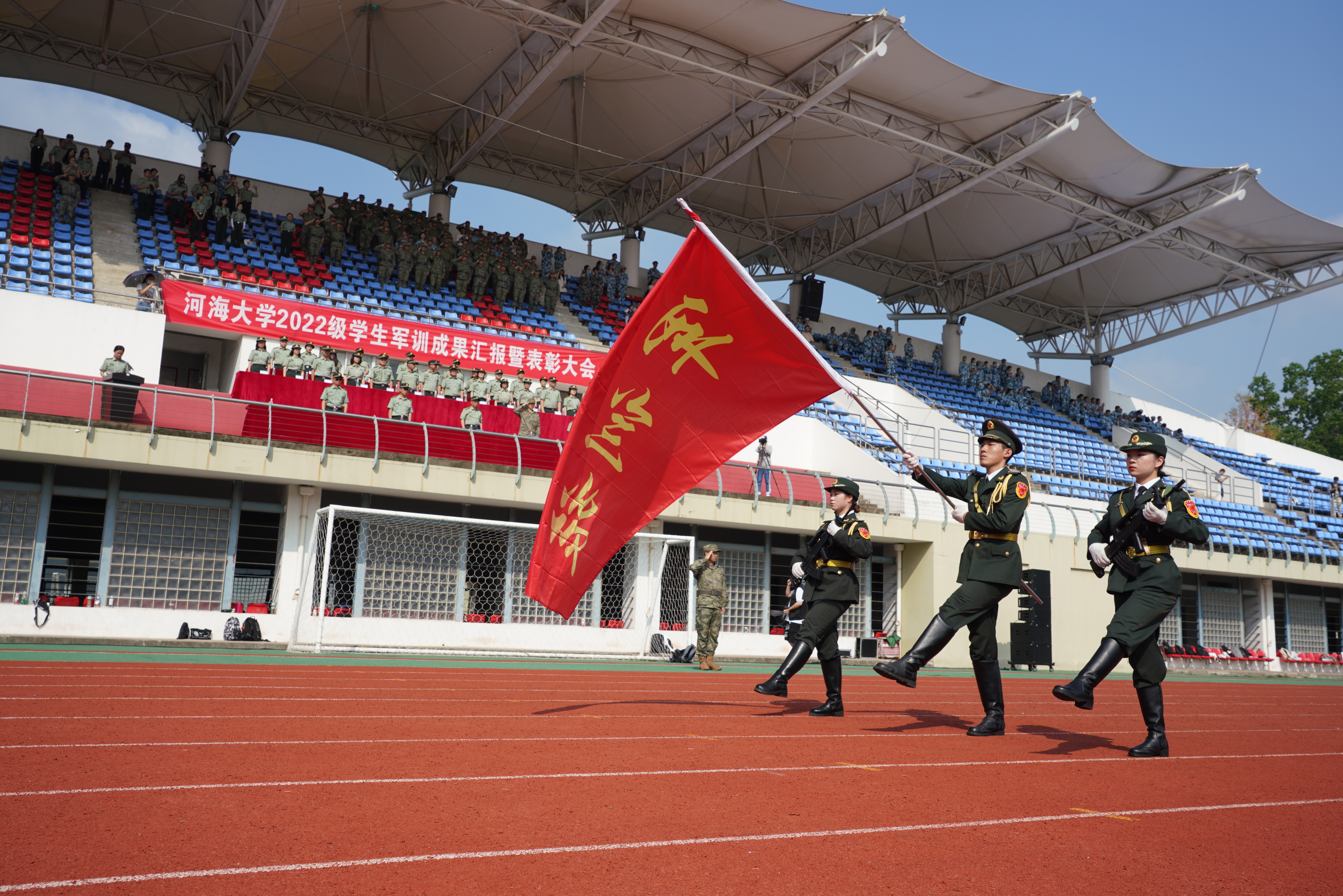 9月17日,我校举行2022级学生军训成果汇报暨表彰大会。校长徐辉,2022级学生军训旅政委、校党委副书记郭继超,2022级学生军训旅旅长、副校长董增川,承训部队领导和嘉宾出席大会。