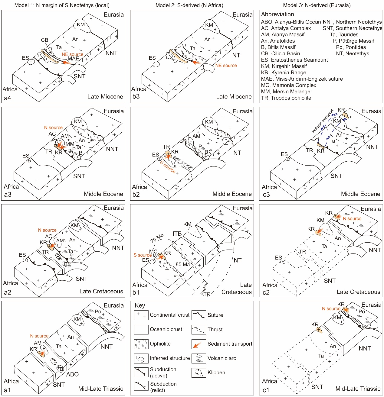 本研究以北塞浦路斯Kyrenia Range地体三叠系至上新统碎屑岩为研究对象,对不同时期碎屑沉积岩开展了系统的碎屑锆石U-Pb年代学、锆石微量元素及Hf同位素研究,剖析了沿地体径(轴)向的物源差异;结合区域的现有地质资料(如岩浆/变质作用、古水流等),对物源区特征进行了有效限定,并对现有的构造演化模型进行了有效检验。